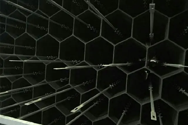 用于湿式电除尘(雾)器的导电玻璃钢阳极管多为正六边形规格,管内切圆直径250mm~400mm,管长可达6米,管壁厚约3mm。阳极管模块由若干根正六边形管组合在一起组成沉淀极。